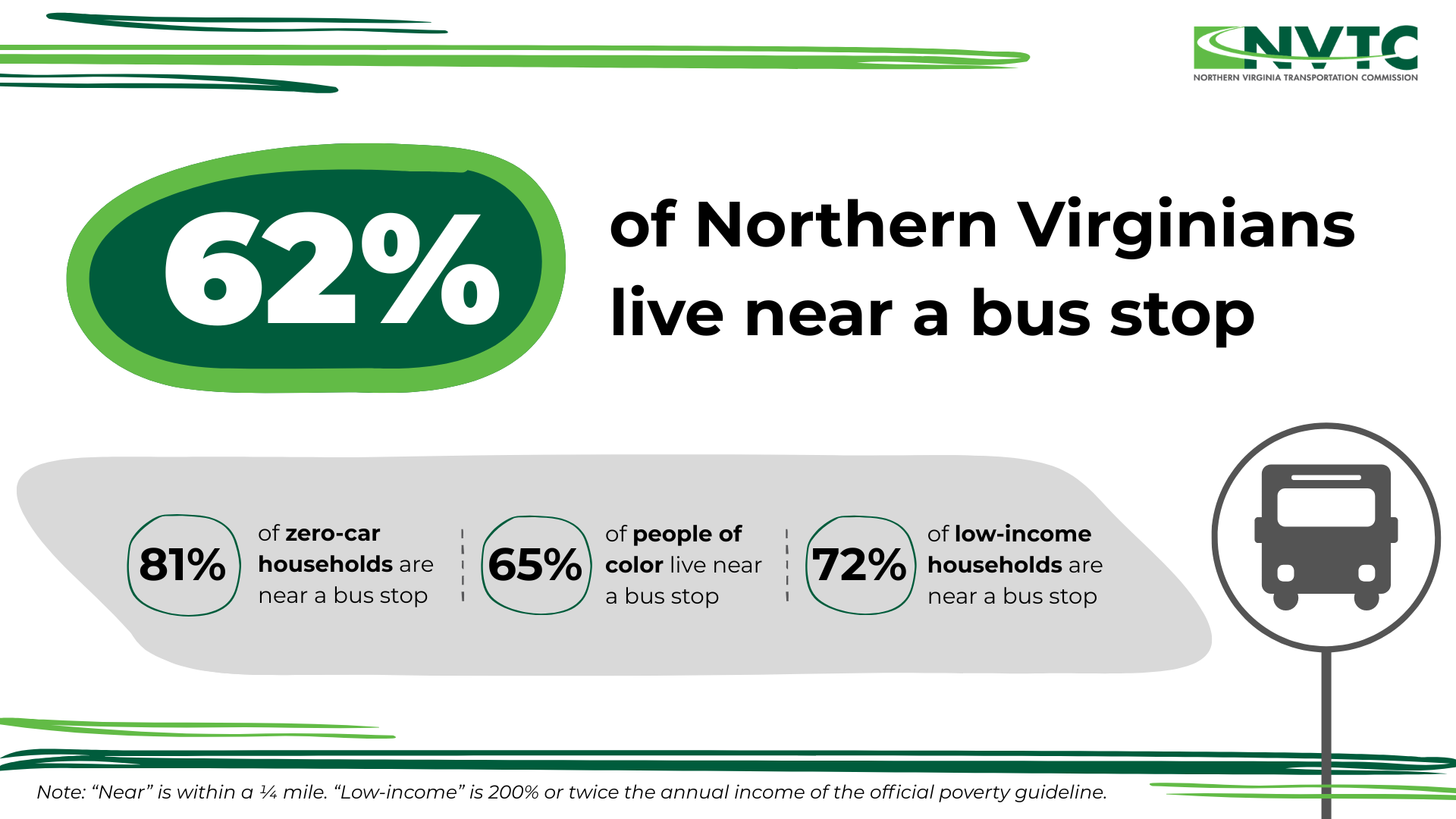 This month, we’re highlighting bus accessibility across our region using data from NVTC’s NoVaTransit Data Dashboard. The data reveal how critical bus service is to connecting diverse communities. Well over half of Northern Virginians live near a bus stop, and the numbers are even higher for people of color, households without a car and households with limited financial resources.
