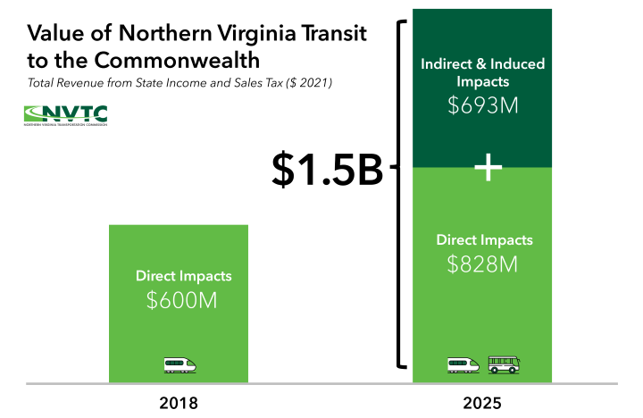 To quantify the value of Northern Virginia’s transit network to the Commonwealth, this study used the MWCOG Regional Travel Demand Forecasting Model to compare a “status quo” scenario for the year 2025 versus a “no transit” scenario for 2025. The “no transit” scenario removed VRE, Metrorail, regional buses and local buses from the network. The model was also adjusted to account for changes in travel patterns and mode choice resulting from COVID. This comparison allowed the research team to compare the increase in vehicle trips, vehicle miles of travel, and vehicle hours of delay that would occur in the region if transit did not exist. The next step was then to remove Northern Virginia households and employment from the model until congestion returned to an acceptable level that was similar to that of the 2025 “status quo” scenario. With the number of households and employment removed, the next step was to calculate reductions in total employment and earnings, followed by the loss in income and sales tax revenue to the Commonwealth. More information is available in the full technical report.