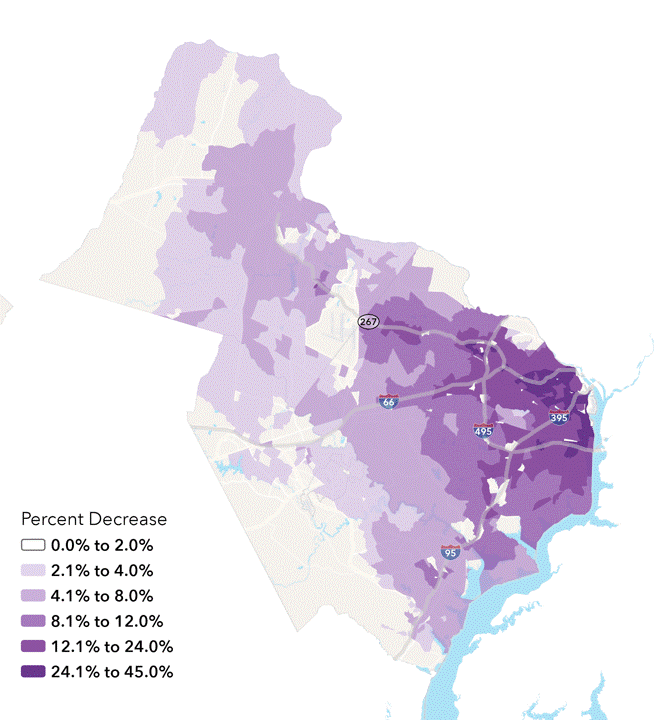 Figure 1 shows the increase in vehicle trips expected to occur during the morning commute as more people drive to get to their destinations. Inside the Beltway, vehicle trips would increase in many places by over 12%.